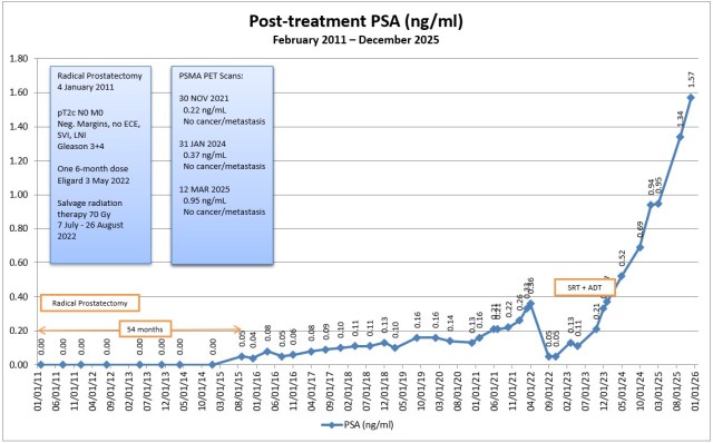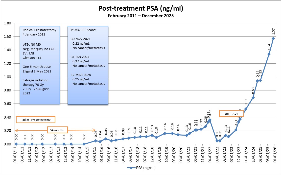 It’s been more than thirteen years after my surgery and, unfortunately, the cancer has reared its ugly head once again. In the summer of 2022, I went through salvage radiation therapy to the prostate bed with concurrent androgen deprivation therapy. Now, in 2024, it appears that the radiation therapy missed its mark and my PSA is on the rise again, to its highest point since my diagnosis.