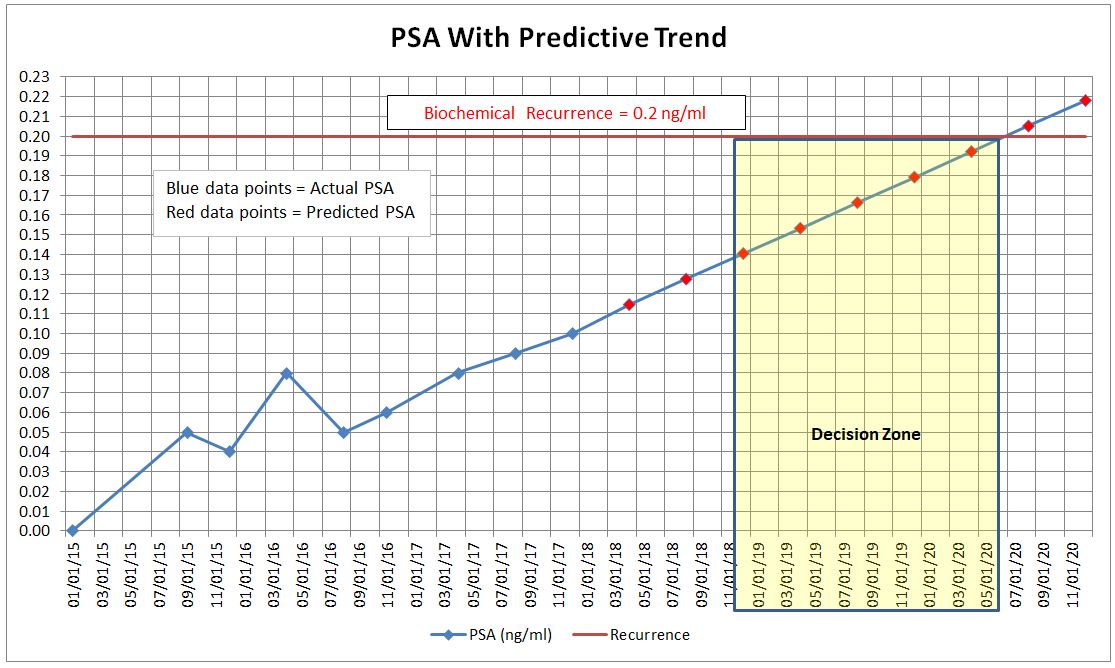 Based on my slow PSA doubling time (around 16 months), if my PSA progresses at its current rate, I’ll have 12 to 28 months to think about this and make my decision, based on whether I want to act if my PSA is around 0.15 or let it go all the way to 0.20. (See my “decision zone” in yellow below—yes, I had to geek out in my spreadsheet once again.) If I want to wait until it’s all the way to 0.5, I’ll have even more time.