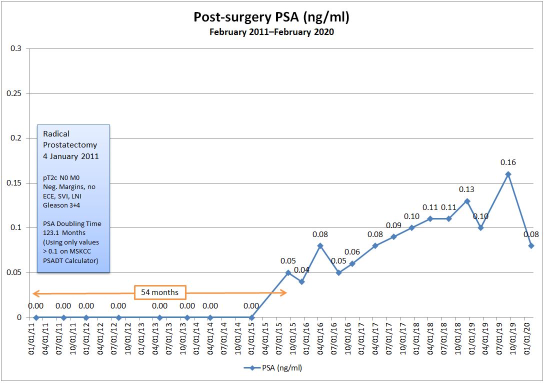 I tried updating my PSA Doubling Time using the MSKCC PSADT calculator, and this bumped my PSADT from 43 months to 123 months. There is a caveat, though. The online calculator accepts only PSA values of 0.10 or more, so I rounded up my 0.08 to 0.10 to run the calculation.