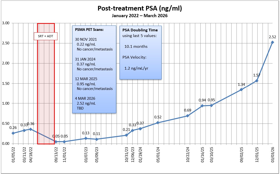Second, my PSA jumped significantly to 2.52 ng/mL from 1.57 ng/mL on 1 December 2025. That gives a PSA doubling time of 10.1 months using the last 5 readings (back to January 2025).