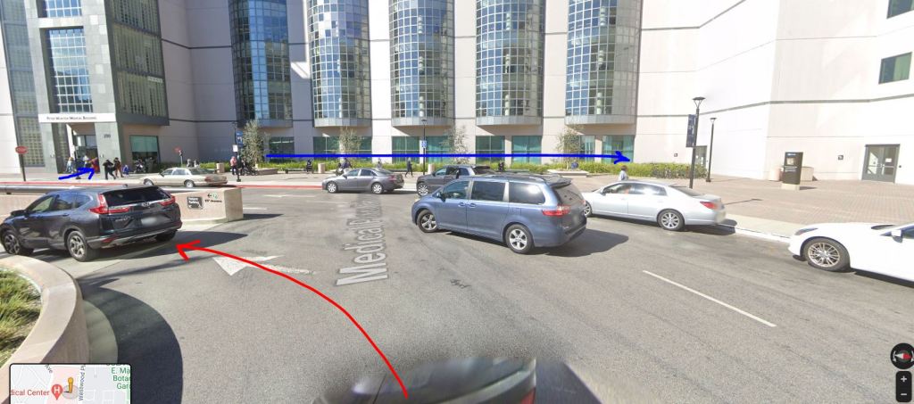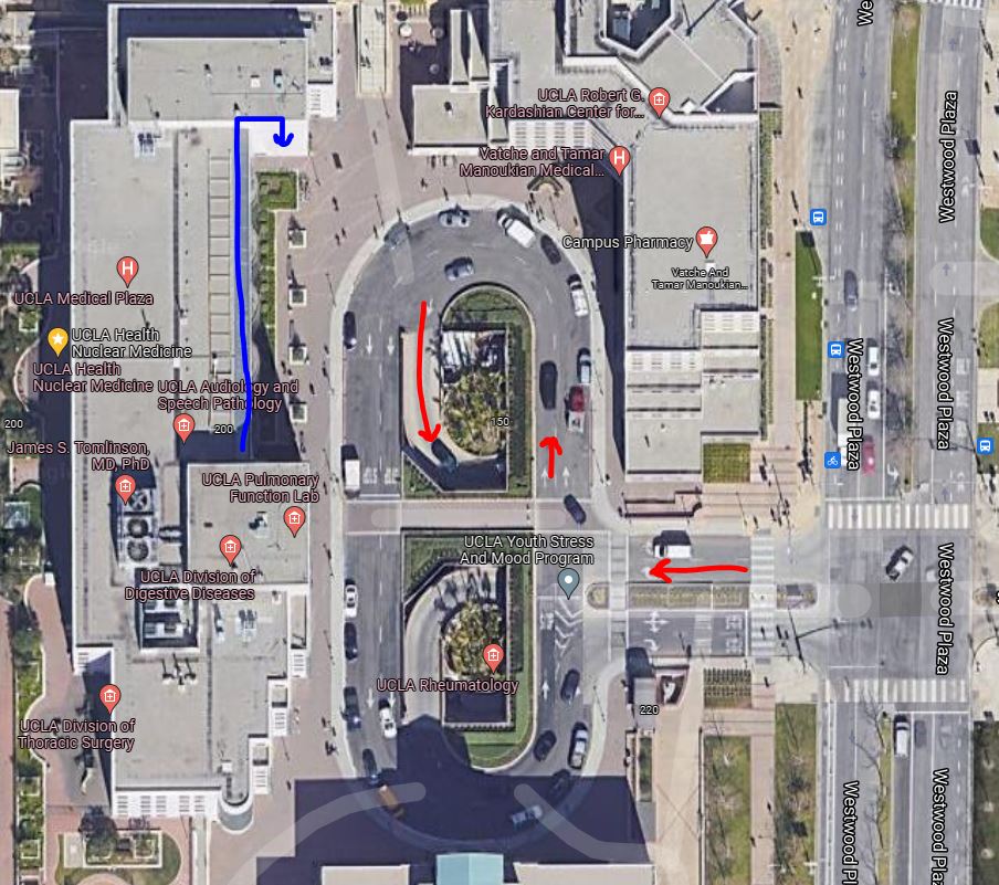 Entrance to parking garage from Westwood Blvd (red line) and walk inside the building from the lobby to the North Elevators (blue line).Photo from Google Maps.Entrance to parking garage (red arrow) and walk along the front of the building (inside) from the lobby to the North Elevators.Photo from Google Maps.