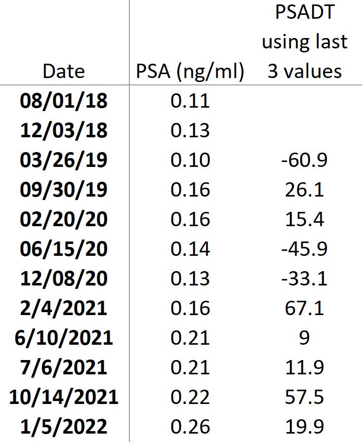 Of course, the engineer in me had to play with that a little, so I went through my PSA spreadsheet and calculated the PSA doubling time if I used the last three values after each test. The results were all over the place: