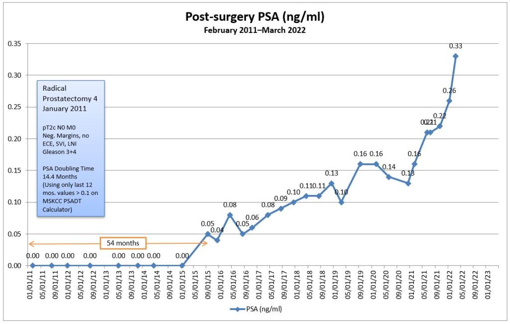 What puzzled him about my case is how long after my surgery the PSA returned and how slowly it was increasing over the years. That led to a discussion about PSA doubling time and how my doubling time is shortening at an accelerating rate.